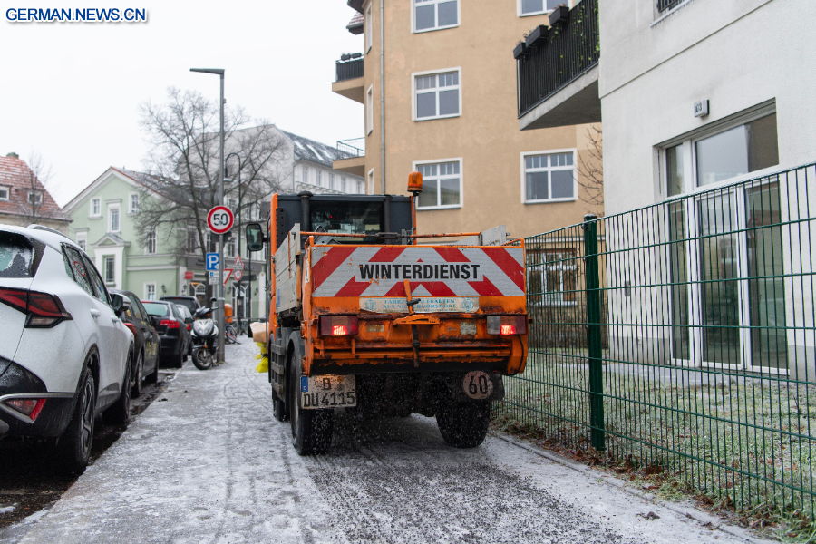 BERLIN, 27. Januar 2026 (Xinhua) -- Ein Winterdienstfahrzeug streut Splitt auf einen Gehweg im Berliner Stadtbezirk Pankow, 26. Januar 2026. In Berlin kam es am Montag zu Glatteis, was zu Störungen im Straßenbahnverkehr und anderen öffentlichen Verkehrsmitteln führte. (Xinhua/Zhang Haofu)