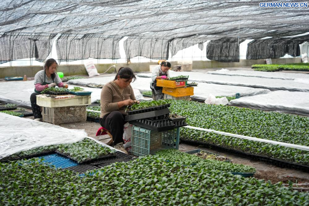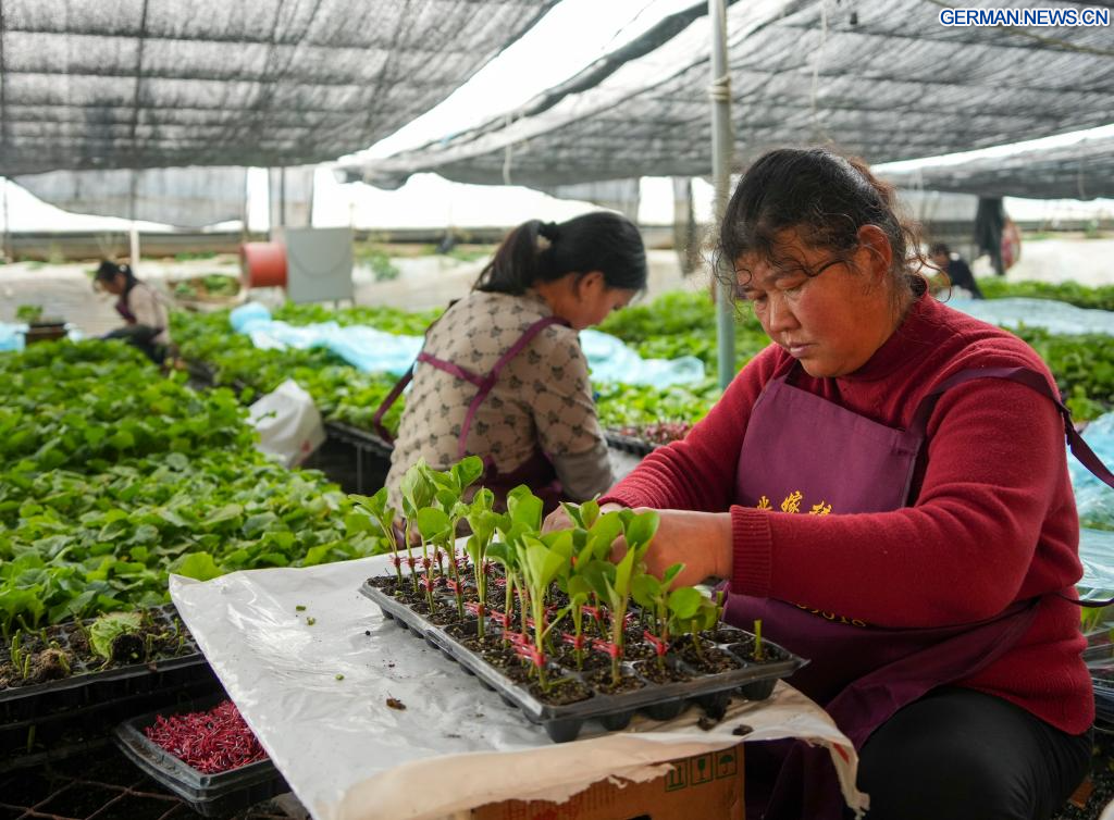JINAN, 28. Januar 2026 (Xinhuanet) -- Bäuerinnen pfropfen Gemüsesetzlinge in einem Gewächshaus in der Gemeinde Yandian im Kreis Shenxian in der ostchinesischen Provinz Shandong, 28. Januar 2026. Als wichtiger Gemüselieferant verfügt Shenxian über eine Anbaufläche von mehr als 1 Million Mu (etwa 66.666,7 Hektar) und erreicht eine Jahresproduktion von 5,2 Millionen Tonnen. (Quelle: Xinhua/Xu Suhui)