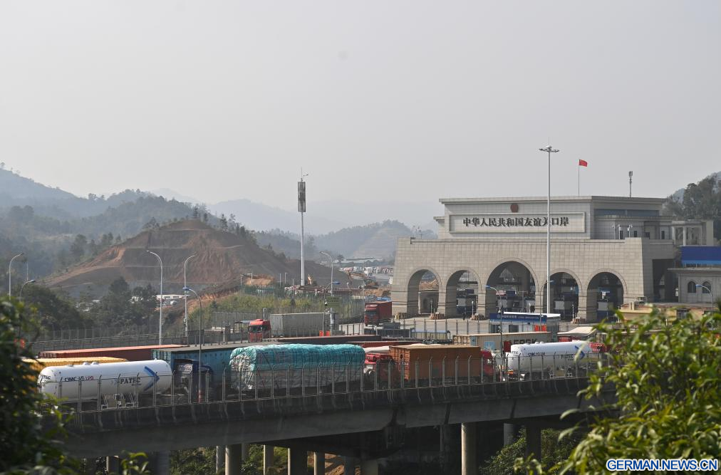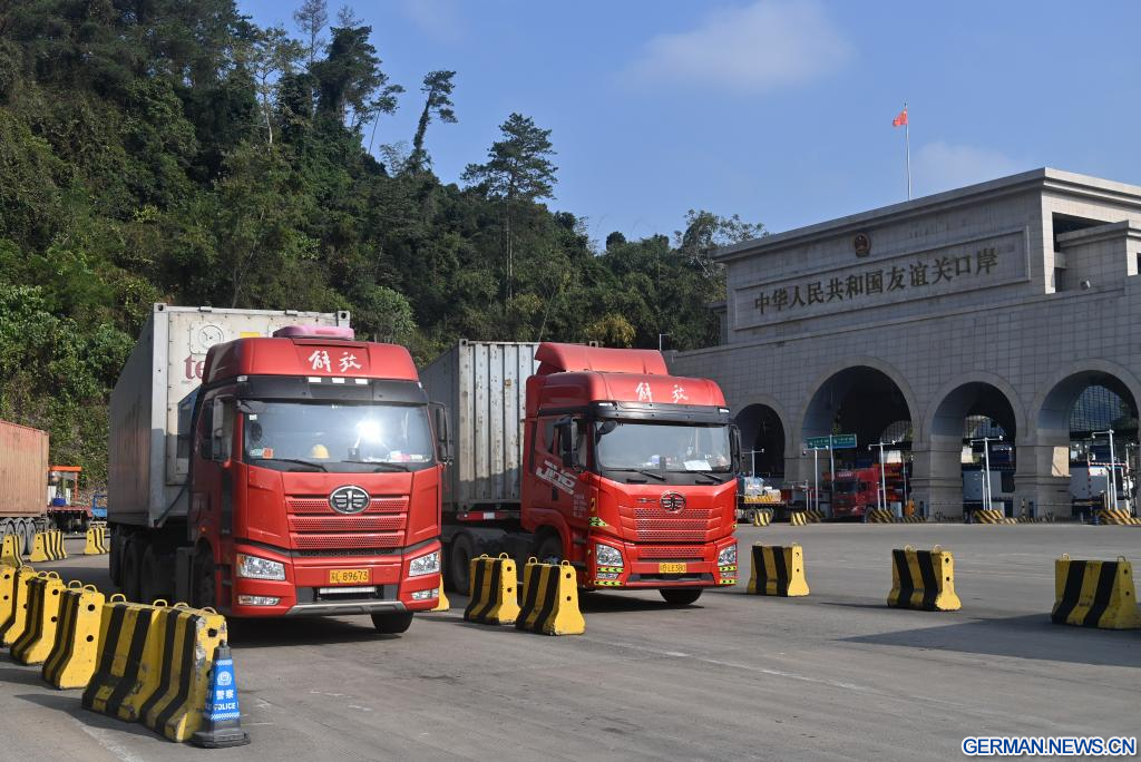 PINGXIANG, 28. Januar 2026 (Xinhuanet) -- Fahrzeuge mit Ziel Vietnam sind nach der Zollabfertigung im Hafen Youyiguan, auch bekannt als „Freundschaftspass“, in der Stadt Pingxiang im südchinesischen Autonomen Gebiet Guangxi der Zhuang fotografiert, 28. Januar 2026. (Quelle: Xinhua/Lu Boan)