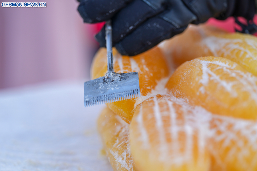 HARBIN, 29. Januar 2026 (Xinhua) -- Ein Eisskulpturenkünstler schnitzt eine pflanzengefärbte Eisskulptur in der Eis- und Schneewelt von Harbin in der Provinz Heilongjiang im Nordosten Chinas, 28. Januar 2026. Durch die Verwendung von pflanzengefärbtem Eis für ihre Schnitzereien haben die Eisskulpturenkünstler der diesjährigen Eis- und Schneewelt von Harbin ein neues visuelles Erlebnis in die Kunst des Eisschnitzens gebracht.