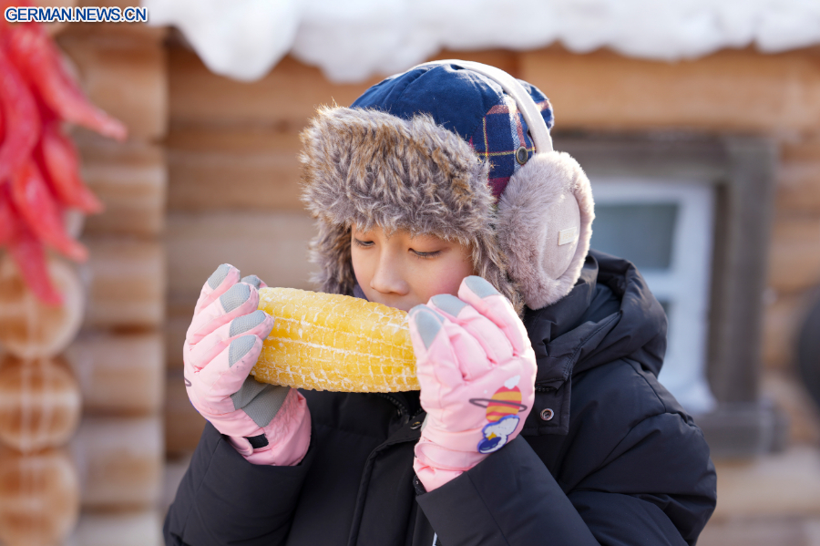 HARBIN, 29. Januar 2026 (Xinhua) -- Skulpturenkünstler präsentieren pflanzengefärbte Eisskulpturen in der Eis- und Schneewelt von Harbin in der Provinz Heilongjiang im Nordosten Chinas, 28. Januar 2026. Durch die Verwendung von pflanzengefärbtem Eis für ihre Schnitzereien haben die Eisskulpturenkünstler der diesjährigen Eis- und Schneewelt von Harbin ein neues visuelles Erlebnis in die Kunst des Eisschnitzens gebracht.