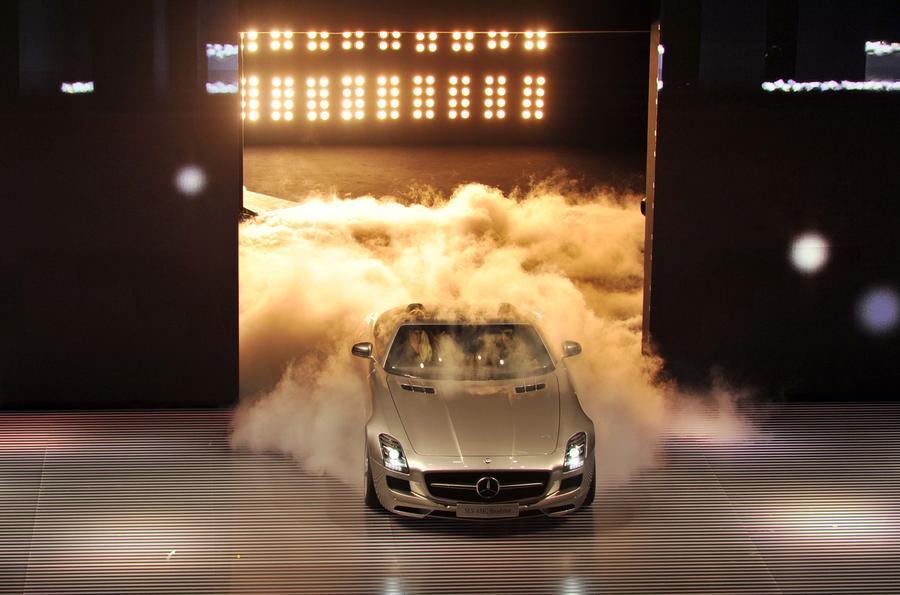 Das Foto zeigt einen Mercedes-Benz SLS AMG Roadster während einer Präsentation auf der Internationalen Automobilausstellung (IAA) in Frankfurt am Main, 13. September 2011. (Xinhua/Ma Ning)