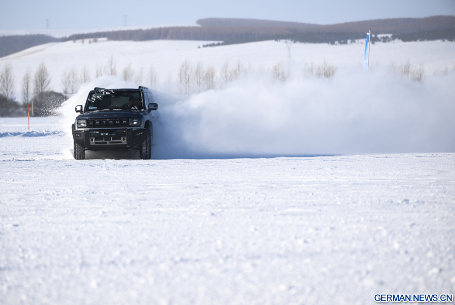 YAKESHI, 30. Januar 2026 (Xinhua) -- Ein Auto fährt auf einer vereisten Straße auf einem Automobil-Testgelände in Yakeshi in Hulun Buir in der Autonomen Region Innere Mongolei in Nordchina, 22. Januar 2026. Yakeshi ist aufgrund seiner langen und kalten Wintersaison ein wichtiger Standort für Fahrzeugtests in kalten Regionen. Eine große Anzahl von Ingenieuren und Technikern besucht die Stadt im Winter regelmäßig zu beruflichen Zwecken, doch sie werden auch zu einer stabilen Kundengruppe für andere vor Ort angebotene Dienstleistungen.