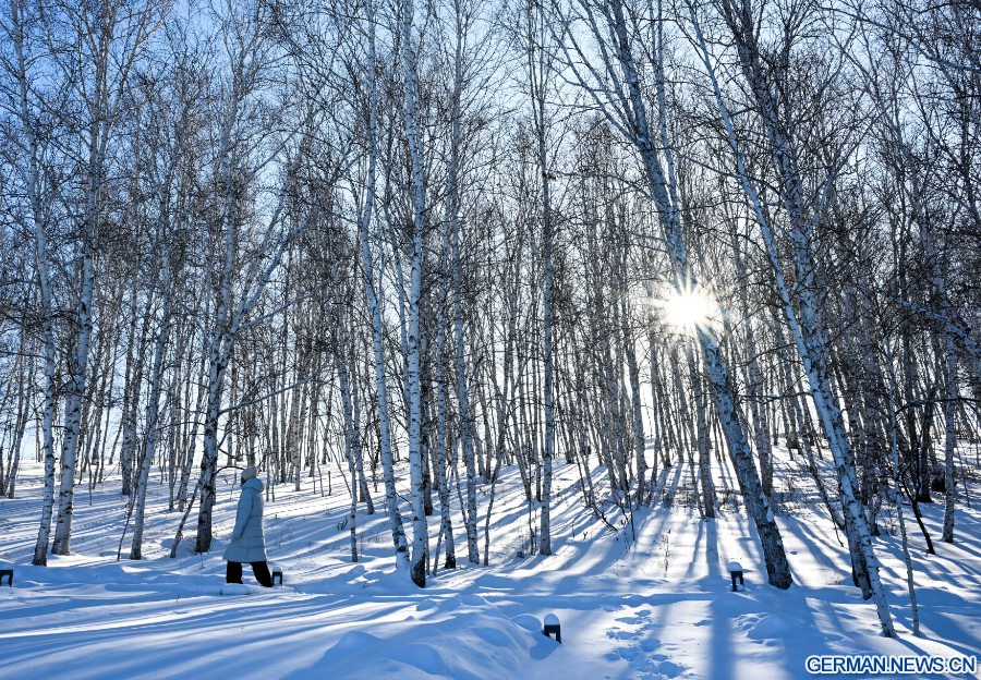 YAKESHI, 30. Januar 2026 (Xinhua) -- Eine Touristin spaziert durch einen Birkenwald in Yakeshi in Hulun Buir in der Autonomen Region Innere Mongolei in Nordchina, 21. Januar 2026. Yakeshi ist aufgrund seiner langen und kalten Wintersaison ein wichtiger Standort für Fahrzeugtests in kalten Regionen. Eine große Anzahl von Ingenieuren und Technikern besucht die Stadt im Winter regelmäßig zu beruflichen Zwecken, doch sie werden auch zu einer stabilen Kundengruppe für andere vor Ort angebotene Dienstleistungen.
