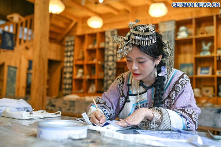 Eine Touristin probiert Batiken in einer landwirtschaftlichen Genossenschaft im Dorf Zhaoxing der Dong im Kreis Liping in der Provinz Guizhou im Südwesten Chinas, 19. Dezember 2025. (Xinhua/Yang Wenbin)