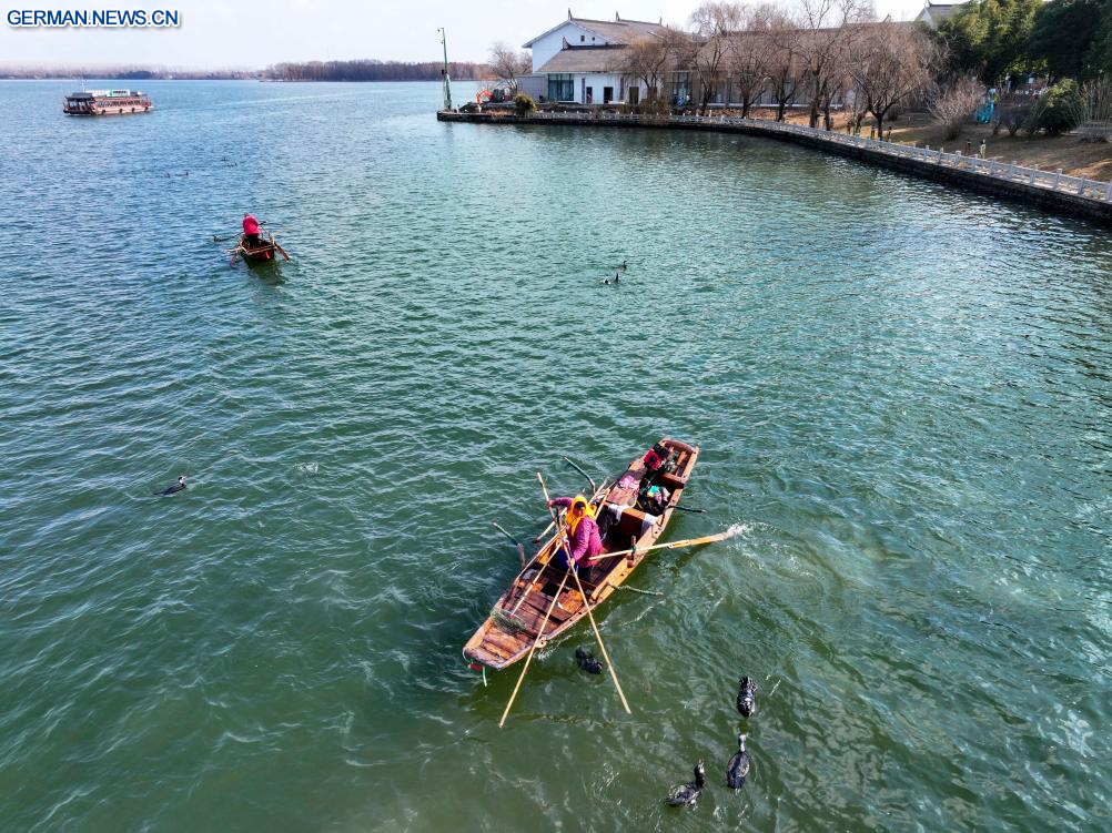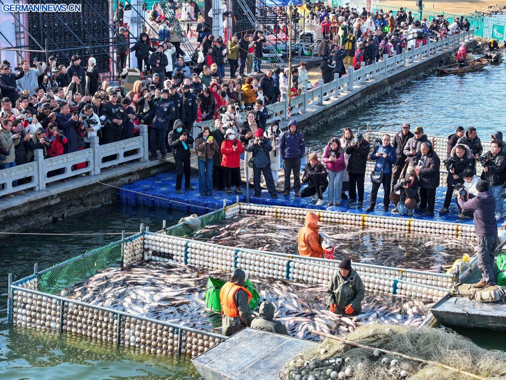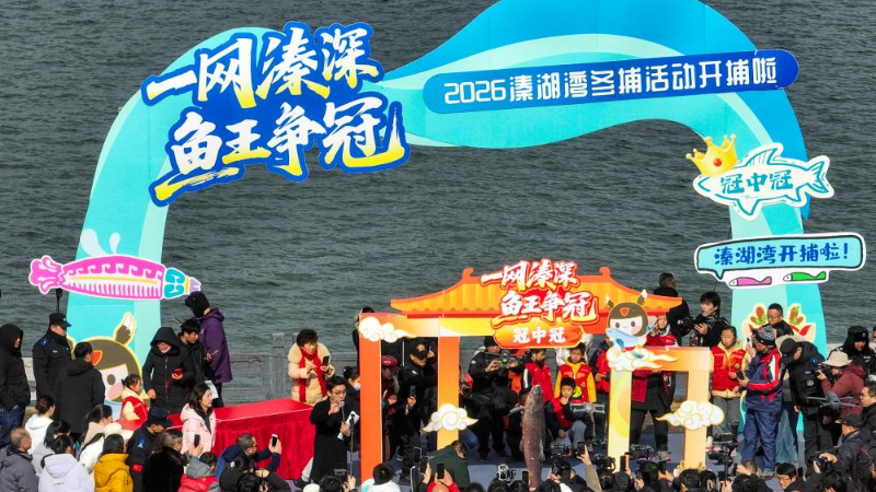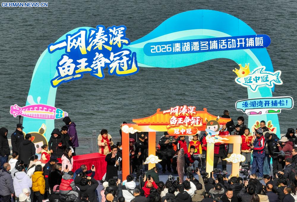 TAIZHOU, 31. Januar 2026 (Xinhuanet) -- Das Drohnenfoto zeigt Menschen, die an einer Winterfischereiveranstaltung in Taizhou in der ostchinesischen Provinz Jiangsu teilnehmen, 31. Januar 2026. (Foto von Tang Dehong/Xinhua)