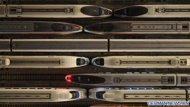 Hochgeschwindigkeitszüge in ganz China stehen für den bevorstehenden jährlichen Reiseansturm zum Frühlingsfest bereit, der auch als Chunyun bekannt ist und am 2. Februar 2026 beginnt. Jedes Jahr kehren Millionen von Menschen, die außerhalb ihrer Heimatstädte arbeiten, studieren oder leben, während dieser Hauptreisezeit zum Frühlingsfest, dem wichtigsten traditionellen Feiertag Chinas, nach Hause zurück und bilden damit die weltweit größte jährliche Migration von Menschen. (Xinhua/Deng Hua)