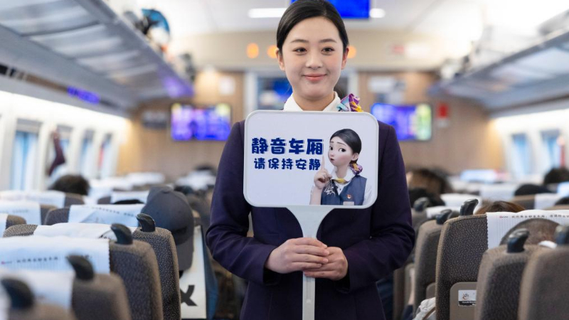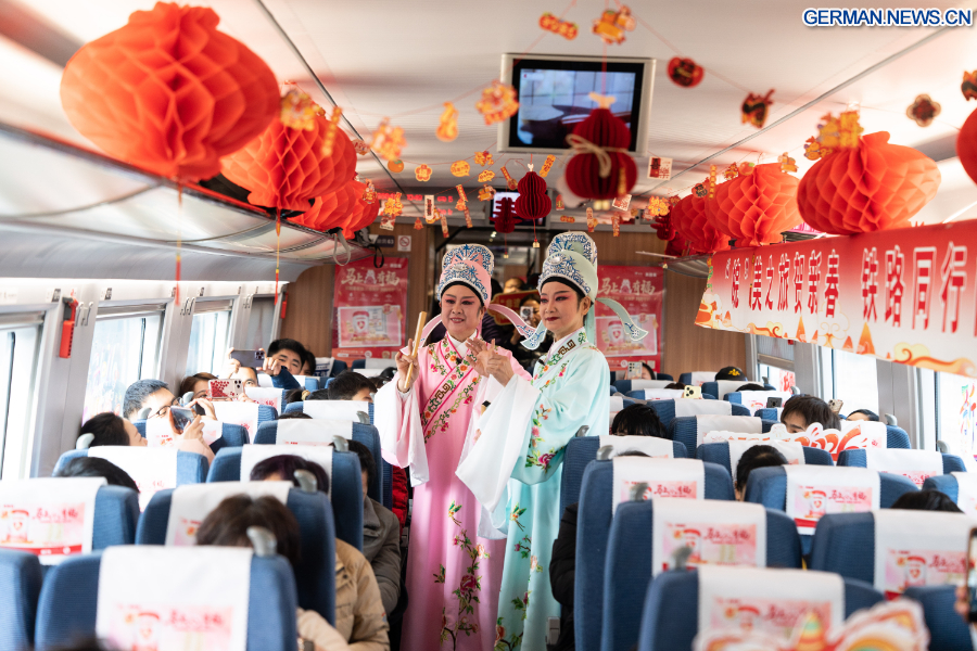 BEIJING, 2. Februar 2026 (Xinhua) -- Das Foto zeigt eine lokale Opernaufführung in einem Hochgeschwindigkeitszug in der Provinz Anhui in Ostchina, 2. Februar 2026.