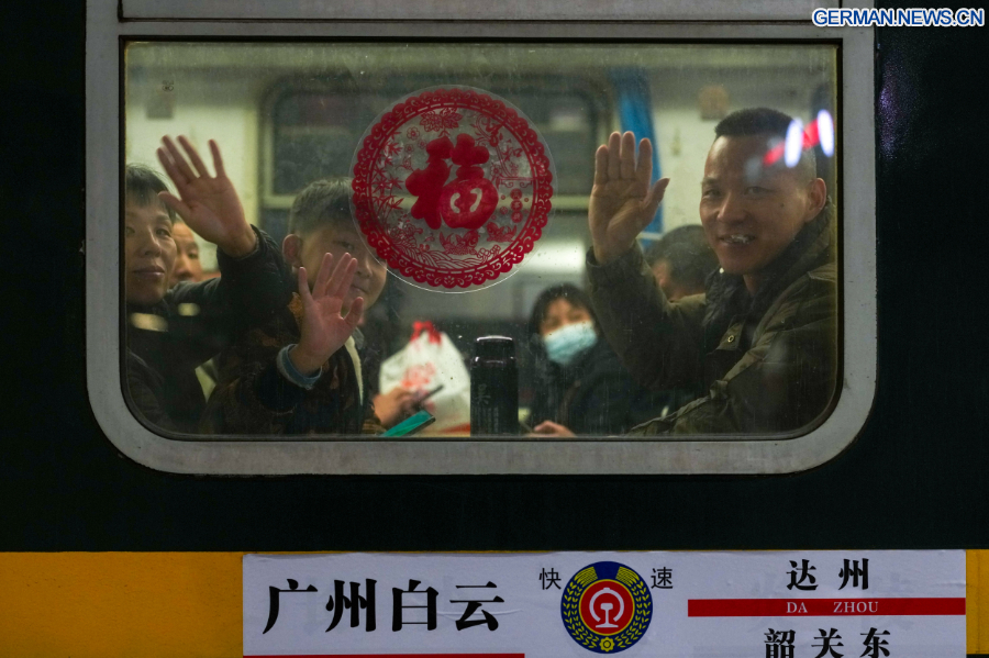 BEIJING, 2. Februar 2026 (Xinhua) -- Passagiere winken zum Abschied aus einem Zug am Bahnhof Guangzhou Baiyun in Guangzhou in der Provinz Guangdong in Südchina, 1. Februar 2026.
