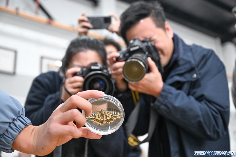 CHONGQING, 3. Februar 2026 (Xinhua) -- Medienvertreter fotografieren das Exemplar eines Schmetterlings im Zentrum für Weltraumforschung des Bildungsministeriums an der Chongqing-Universität im südwestchinesischen Chongqing, 2. Februar 2026. Forscher der chinesischen Chongqing-Universität gaben am Montag bekannt, dass ein Schmetterling während der Erdumrundung erfolgreich aus seiner Puppe geschlüpft ist und wertvolle Daten über das biologische Überleben in der rauen Mikrogravitationsumgebung des Weltraums geliefert hat.