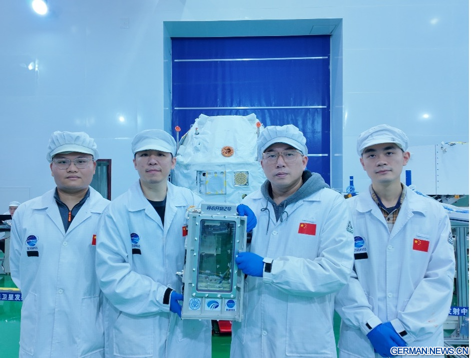 CHONGQING, 3. Februar 2026 (Xinhua) -- Forscher posieren für ein Foto mit der kleinen experimentellen Nutzlast für ein Weltraumökosystem im Weltraumbahnhof Jiuquan Satellite Launch Center im Nordwesten Chinas, 2. Dezember 2025. Forscher der chinesischen Chongqing-Universität gaben am Montag bekannt, dass ein Schmetterling während der Erdumrundung erfolgreich aus seiner Puppe geschlüpft ist und wertvolle Daten über das biologische Überleben in der rauen Mikrogravitationsumgebung des Weltraums geliefert hat.