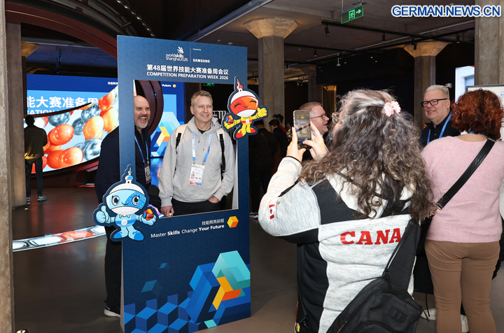 SHANGHAI, 6. Februar 2026 (Xinhua) -- Gäste posieren für ein Foto vor der Ausstellungstafel der Vorbereitungswoche auf den 48. WorldSkills-Wettbewerb im WorldSkills-Museum in Shanghai in Ostchina, 4. Februar 2026. Als eine der Aktivitäten der Vorbereitungswoche auf den 48. WorldSkills-Wettbewerb fand am Mittwoch in Shanghai eine Werbekampagne und Erlebnisveranstaltung zum immateriellen Kulturerbe statt, an der mehr als 700 Gäste aus dem In- und Ausland teilnahmen. (Xinhua/Fang Zhe)