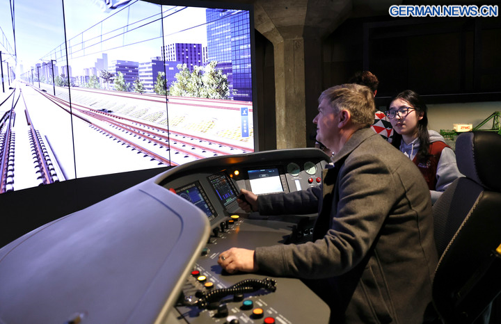 SHANGHAI, 6. Februar 2026 (Xinhua) -- Ein Gast erlebt eine Simulationsfahrt mit einem Hochgeschwindigkeitszug im WorldSkills-Museum in Shanghai in Ostchina, 4. Februar 2026. Als eine der Aktivitäten der Vorbereitungswoche auf den 48. WorldSkills-Wettbewerb fand am Mittwoch in Shanghai eine Werbekampagne und Erlebnisveranstaltung zum immateriellen Kulturerbe statt, an der mehr als 700 Gäste aus dem In- und Ausland teilnahmen. (Xinhua/Fang Zhe)