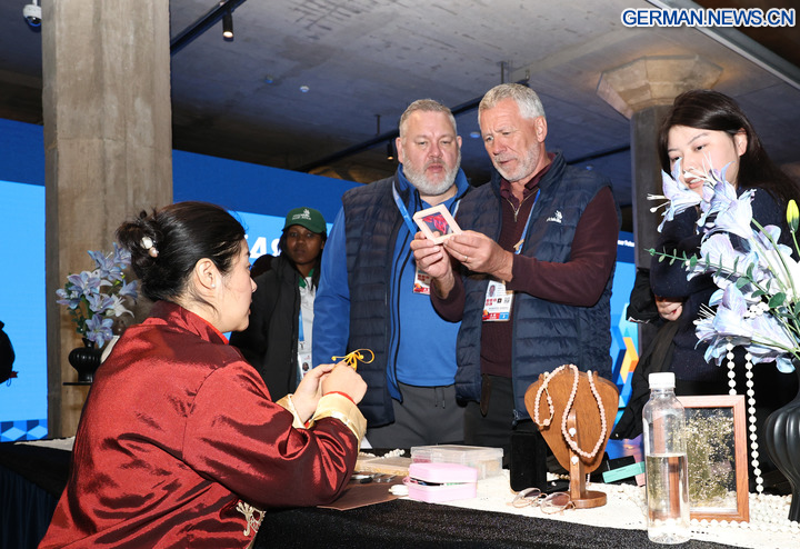 SHANGHAI, 6. Februar 2026 (Xinhua) -- Gäste betrachten chinesische Knoten an einem Stand zur Ausstellung des immateriellen Kulturerbes im WorldSkills-Museum in Shanghai in Ostchina, 4. Februar 2026. Als eine der Aktivitäten der Vorbereitungswoche auf den 48. WorldSkills-Wettbewerb fand am Mittwoch in Shanghai eine Werbekampagne und Erlebnisveranstaltung zum immateriellen Kulturerbe statt, an der mehr als 700 Gäste aus dem In- und Ausland teilnahmen. (Xinhua/Fang Zhe)