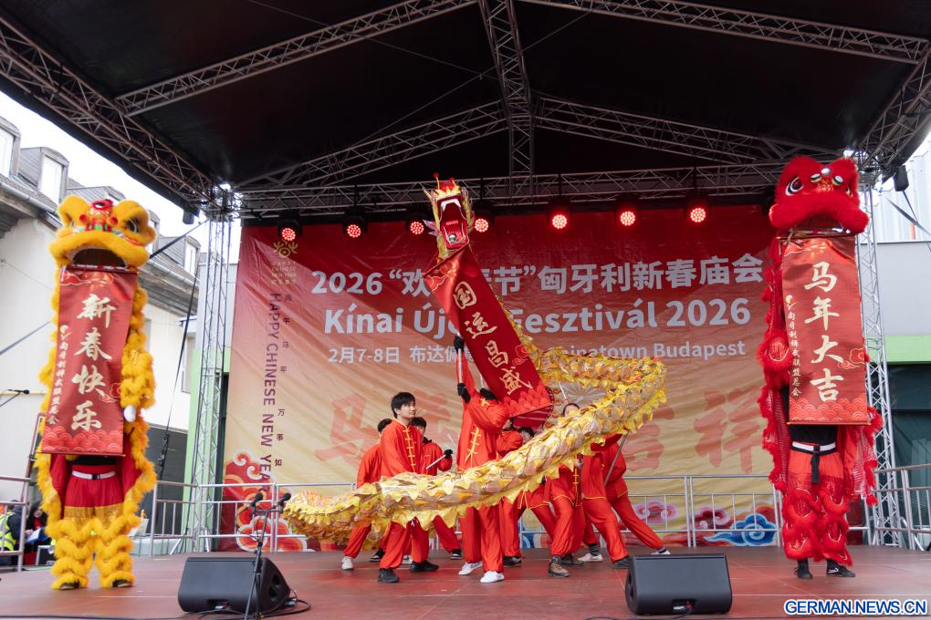 BUDAPEST, 8. Februar 2026 (Xinhuanet) -- Ein Mann macht ein Selfie mit Darstellerinnen in traditionellen Kostümen während des Tempelfestes zum Frühlingsfest in Budapests Chinatown in Budapest, Ungarn, 7. Februar 2026. (Foto von Laszlo Balogh/Xinhua)