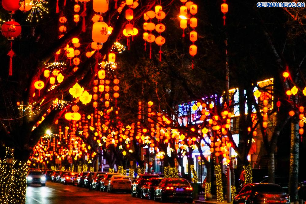 BEIJING, 8. Februar 2026 (Xinhuanet) -- Das am 7. Februar 2026 aufgenommene Foto zeigt Laternen, die zur Feier des Frühlingsfestes in Chinas Hauptstadt Beijing aufgehängt wurden. (Foto von Liu Mancang/Xinhua)