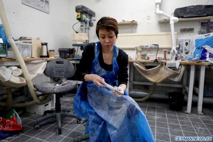 NUUK, 9. Februar 2026 (Xinhua) -- Eine Handwerkerin fertigt Kunsthandwerk aus Seifenstein in einer Werkstatt in Nuuk in Grönland, einem autonomen Gebiet Dänemarks, 7. Februar 2026. (Xinhua/Li Ying)
