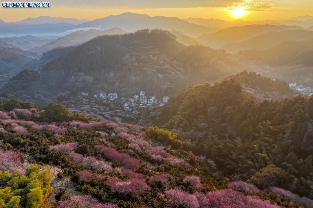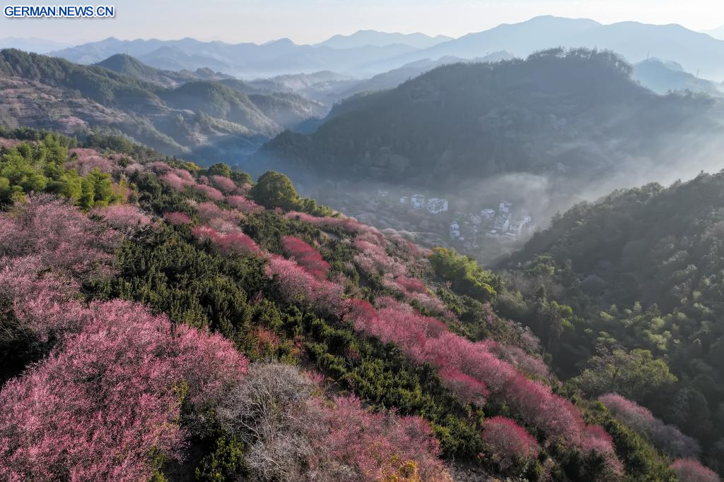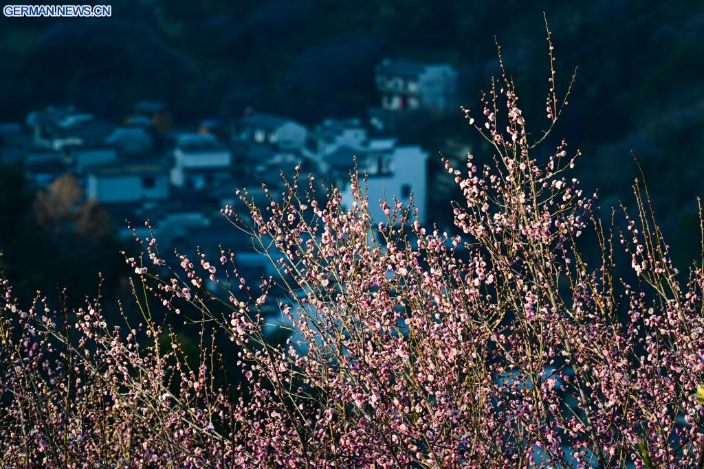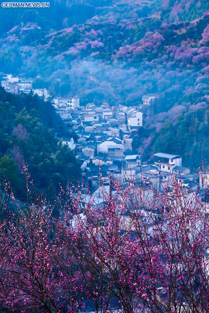 HUANGSHAN, 9. Februar 2026 (Xinhuanet) -- Die Luftaufnahme einer Drohne vom 9. Februar 2026 zeigt die Pflaumenblüten im Dorf Maihuayu im Kreis Shexian in der ostchinesischen Provinz Anhui. (Foto von Fan Chengzhu/Xinhua)