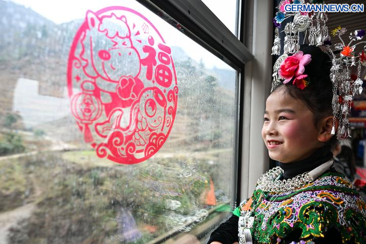 KAILI, 10. Februar 2026 (Xinhua) -- Kinder senden Neujahrsgrüße aus dem Zug Nr. 5640 in der Provinz Guizhou im Südwesten Chinas, 8. Februar 2026. Der Zug Nr. 5640 verkehrt in der Provinz Guizhou zwischen dem Autonomen Kreis Yuping der Dong in der Stadt Tongren und der Provinzhauptstadt Guiyang. Er verbindet mehr als 100 Dörfer ethnischer Minderheiten entlang der Strecke und macht das Reisen für die Dorfbewohner bequemer.