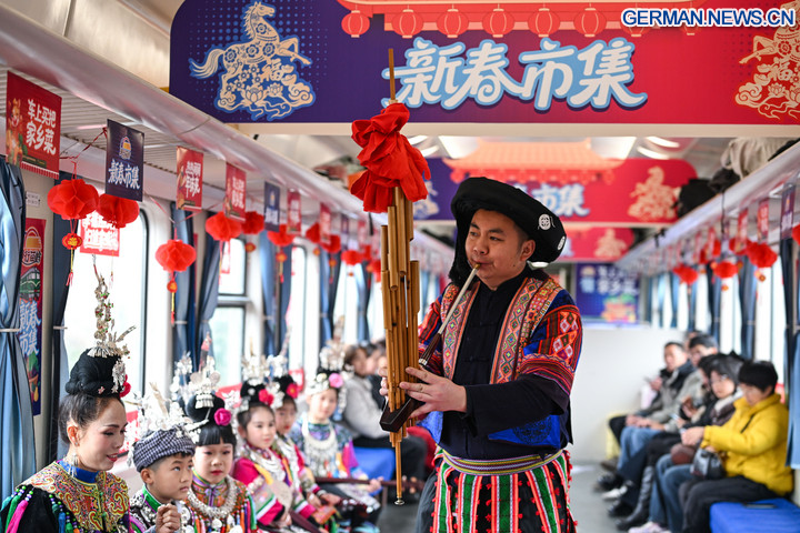 KAILI, 10. Februar 2026 (Xinhua) - Ein Schauspieler spielt auf einer Lusheng, einem traditionellen Rohrblattinstrument im Zug Nr. 5640 in der Provinz Guizhou im Südwesten Chinas, 8. Februar 2026. Der Zug Nr. 5640 verkehrt in der Provinz Guizhou zwischen dem Autonomen Kreis Yuping der Dong in der Stadt Tongren und der Provinzhauptstadt Guiyang. Er verbindet mehr als 100 Dörfer ethnischer Minderheiten entlang der Strecke und macht das Reisen für die Dorfbewohner bequemer.