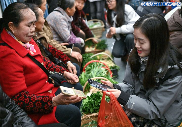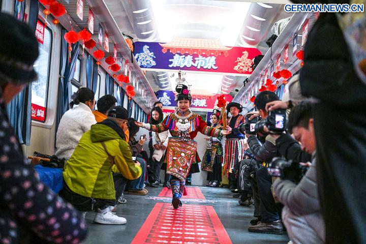 Anlässlich des bevorstehenden chinesischen Neujahrsfests wurde im Zug Nr. 5640 ein Neujahrsmarkt eingerichtet, auf dem den Fahrgästen unterwegs frische landwirtschaftliche Produkte sowie Volksbräuche präsentiert wurden. (Xinhua/Yang Wenbin)