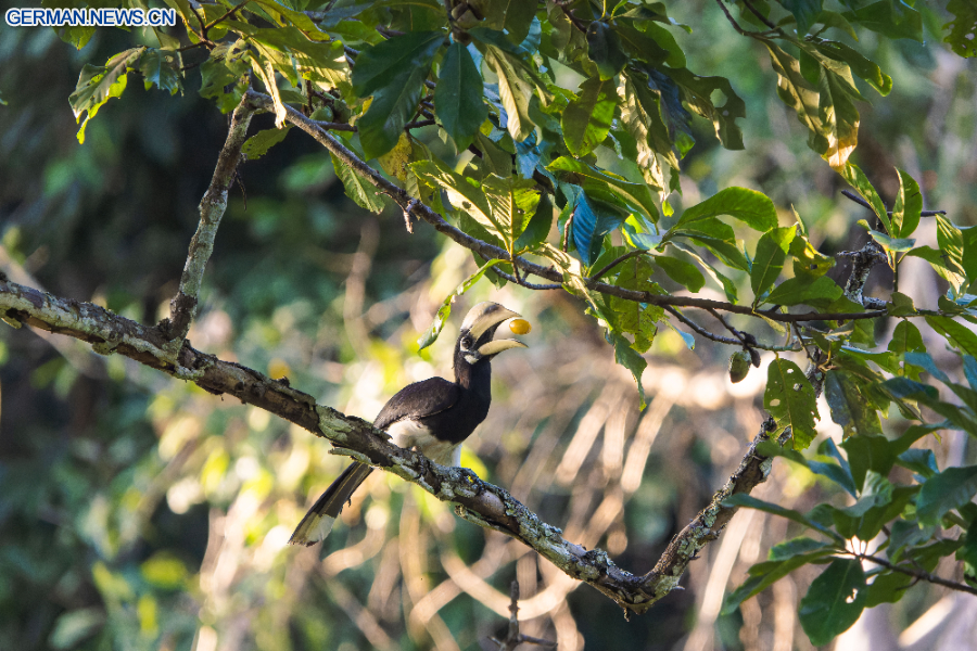 YINGJIANG, 11. Februar 2026 (Xinhua) -- Ein Nashornvogel frisst Früchte auf einem Baum im Dorf Shiti im Kreis Yingjiang in der Provinz Yunnan im Südwesten Chinas, 7. Februar 2026. Im Provinz-Naturschutzgebiet Yunnan Tongbiguan befinden sich Nashornvögel, eine in China unter staatlichem Schutz der höchsten Kategorie stehende Art, in einer kritischen Phase der Brutvorbereitung. Mitglieder des „Nashornvogel-Patrouillenteams” führen regelmäßige Patrouillen durch, um die Sicherheit der Vögel während der Brutzeit zu gewährleisten.