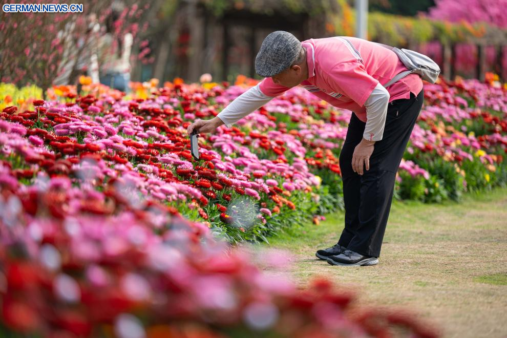 MACAO, 12. Februar 2026 (Xinhuanet) -- Menschen besuchen eine Blumenausstellung im Taipa Houses Museum in Macao in Südchina, 12. Februar 2026. Die Blumenausstellung findet hier zur Feier des bevorstehenden chinesischen Neujahrsfests statt. (Quelle: Xinhua/Cheong Kam Ka)