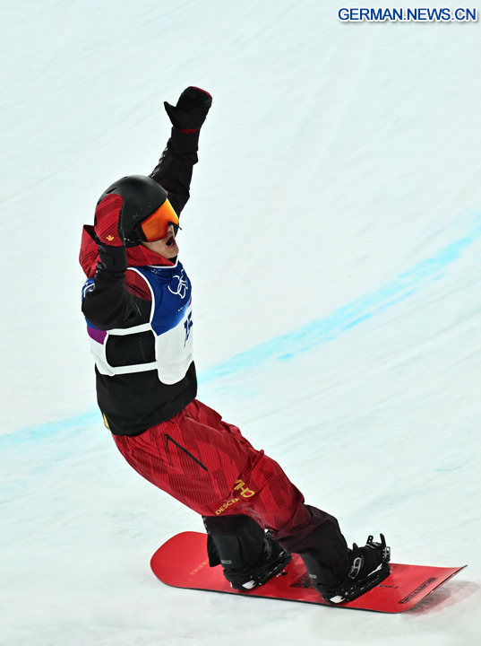 LIVIGNO, 12. Februar 2026 (Xinhua) -- Wang Ziyang aus China jubelt während der Qualifikation im Halfpipe-Wettbewerb der Snowboarder bei den Olympischen Winterspielen 2026 in Mailand-Cortina in Livigno in Italien, 11. Februar 2026.