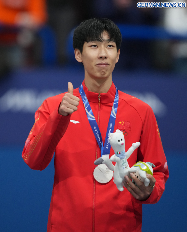 MAILAND, 13. Februar 2026 (Xinhua) -- Das Foto zeigt den Silbermedaillengewinner Sun Long aus China während der Siegerehrung im Shorttrack-Eisschnelllauf der Männer über 1.000 Meter bei den Olympischen Winterspielen 2026 in Mailand-Cortina in Mailand in Italien, 12. Februar 2026.
