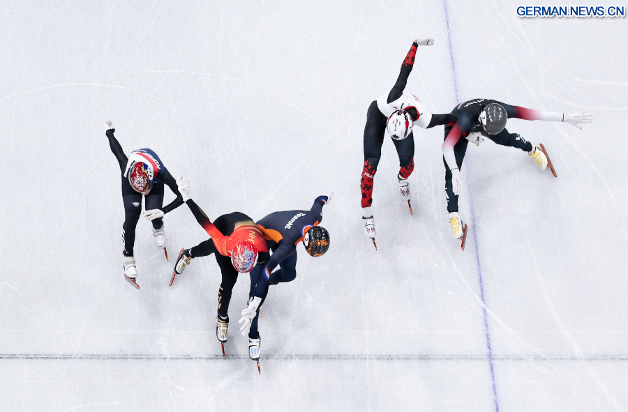 MAILAND, 13. Februar 2026 (Xinhua) -- Sun Long (zweiter von links) aus China überquert die Ziellinie beim Finale A im Shorttrack-Eisschnelllauf der Männer über 1.000 Meter bei den Olympischen Winterspielen 2026 in Mailand-Cortina in Mailand in Italien, 12. Februar 2026.