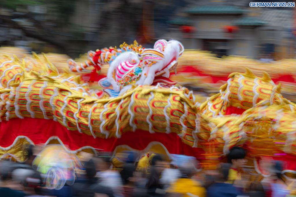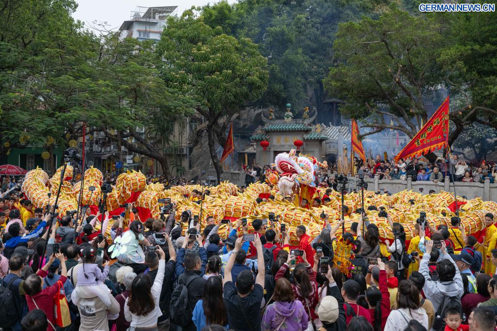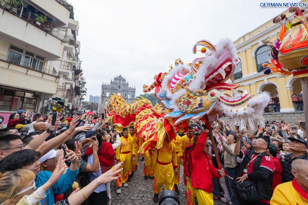 MACAO, 17. Februar 2026 (Xinhuanet) -- Künstler führen in Macao in Südchina einen Drachentanz zur Feier des Frühlingsfestes auf, 17. Februar 2026. (Quelle: Xinhua/Cheong Kam Ka)