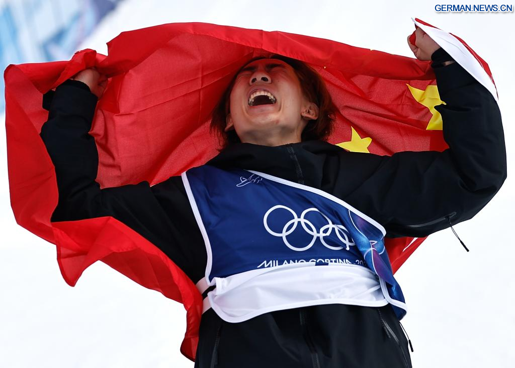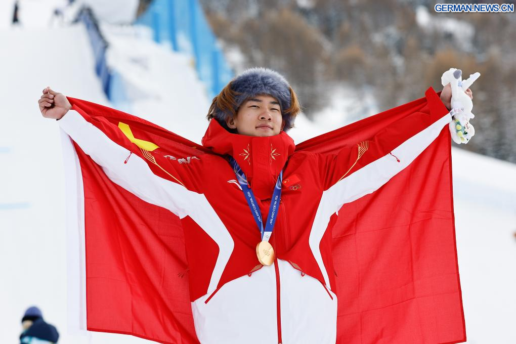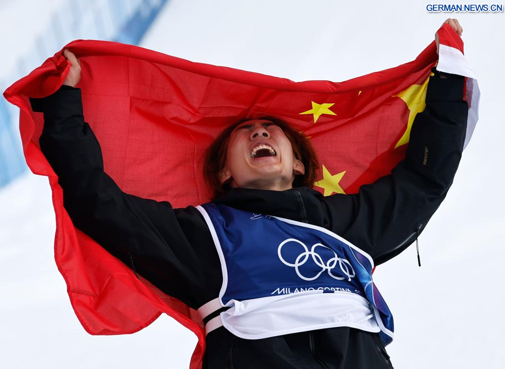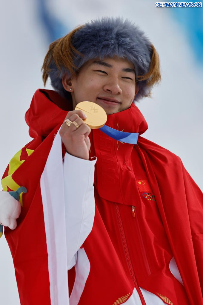 LIVIGNO, 18. Februar 2026 (Xinhuanet) -- Der Goldmedaillengewinner Su Yiming aus China posiert während der Siegerehrung für Snowboard-Slopestyle der Männer bei den Olympischen Winterspielen 2026 in Mailand-Cortina in Livigno, Italien, 18. Februar 2026. (Quelle: Xinhua/Wang Peng)