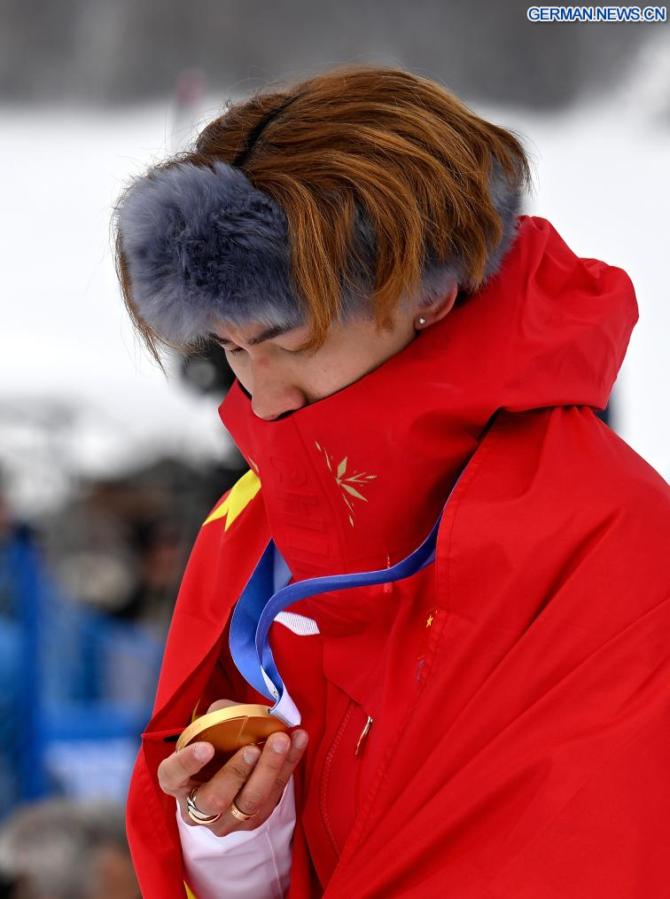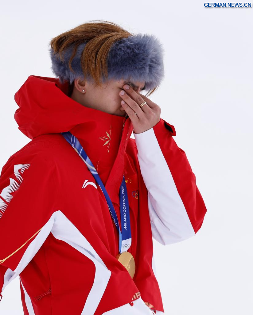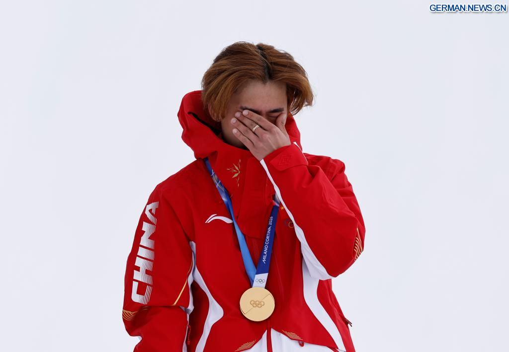 LIVIGNO, 18. Februar 2026 (Xinhuanet) -- Der chinesische Goldmedaillengewinner Su Yiming reagiert während der Siegerehrung für Snowboard-Slopestyle der Männer bei den Olympischen Winterspielen 2026 in Mailand-Cortina in Livigno, Italien, 18. Februar 2026. (Quelle: Xinhua/Wang Peng)