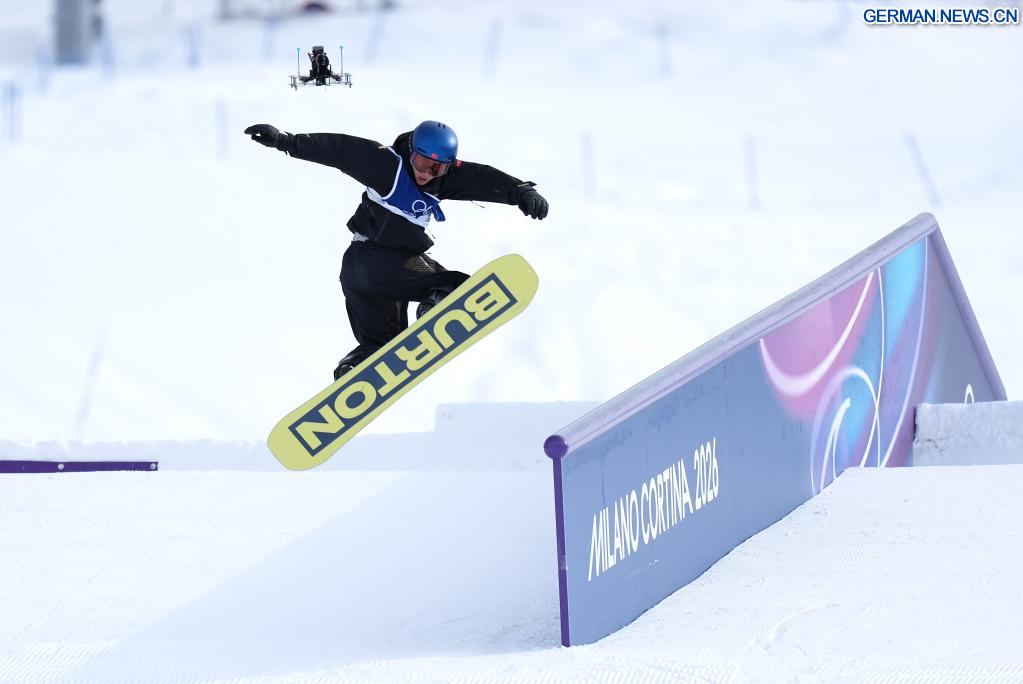 LIVIGNO, 18. Februar 2026 (Xinhuanet) -- Su Yiming aus China wetteifert im Finale des Snowboard-Slopestyle der Männer bei den Olympischen Winterspielen 2026 in Mailand-Cortina in Livigno, Italien, 18. Februar 2026. (Quelle: Xinhua/Xia Yifang)