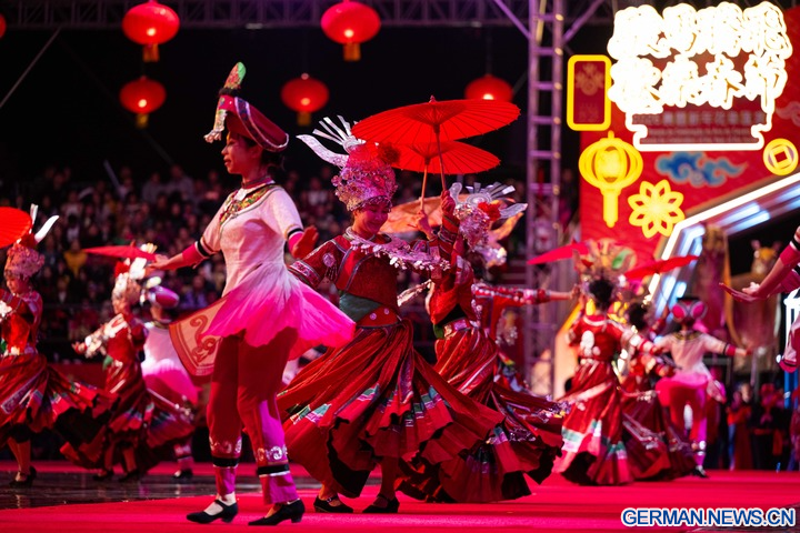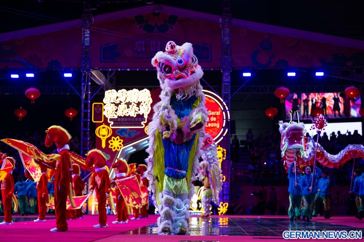 MACAO, 20. Februar 2026 (Xinhua) -- Das Foto zeigt Teilnehmer einer Parade zur Feier des chinesischen Neujahrsfests in Macao in Südchina, 19. Februar 2026. Am Donnerstag veranstaltete das Tourismusbüro der Regierung von Macao eine Parade zur Feier des chinesischen Neujahrsfests, auch bekannt als Frühlingsfest. (Xinhua/Cheong Kam Ka)