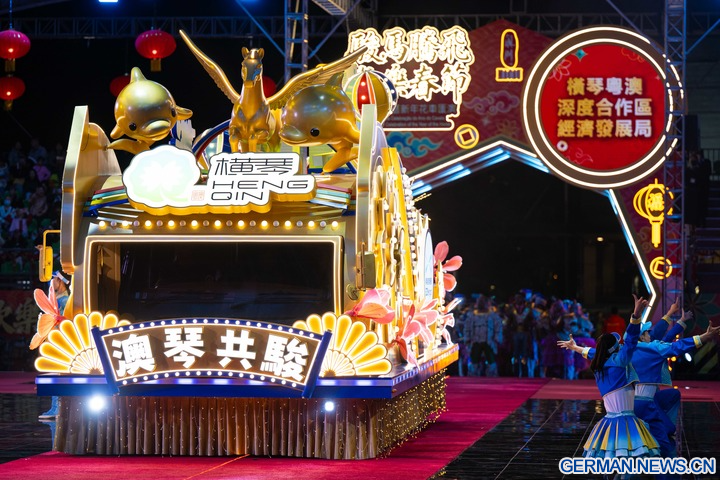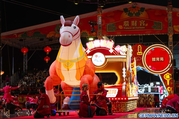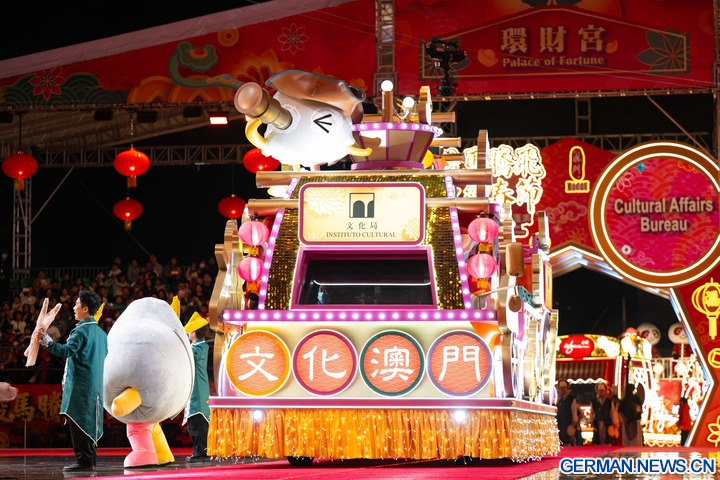 MACAO, 20. Februar 2026 (Xinhua) -- Das Foto zeigt einen Festwagen bei einer Parade zur Feier des chinesischen Neujahrsfests in Macao in Südchina, 19. Februar 2026. Am Donnerstag veranstaltete das Tourismusbüro der Regierung von Macao eine Parade zur Feier des chinesischen Neujahrsfests, auch bekannt als Frühlingsfest. (Xinhua/Cheong Kam Ka)
