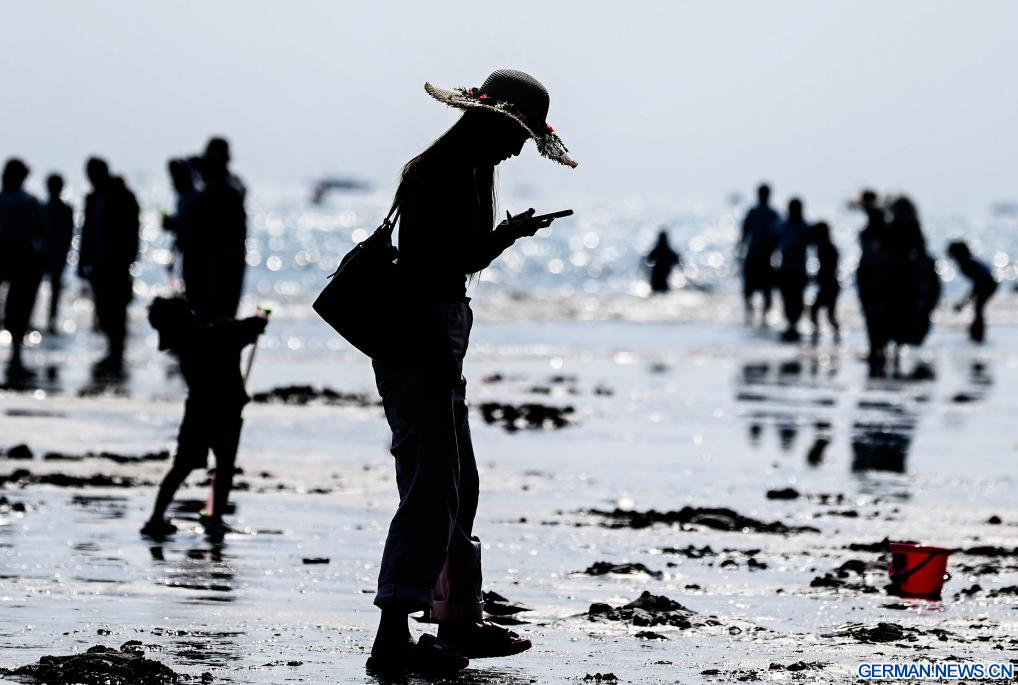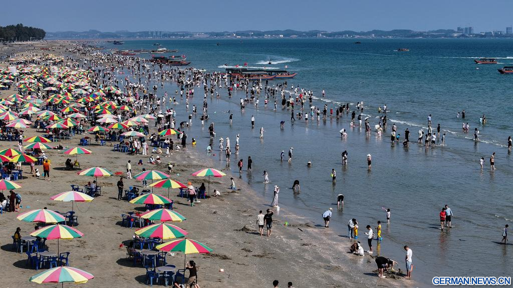 FANGCHENGGANG, 20. Februar 2026 (Xinhuanet) -- Die Luftaufnahme einer Drohne vom 20. Februar 2026 zeigt Touristen an einem Strand in Fangchenggang im südchinesischen Autonomen Gebiet Guangxi der Zhuang. Am vierten Tag des chinesischen Neujahrsfests strömten viele Touristen an diesen Strand, um das Fest zu feiern. (Quelle: Xinhua/Zhang Ailin)