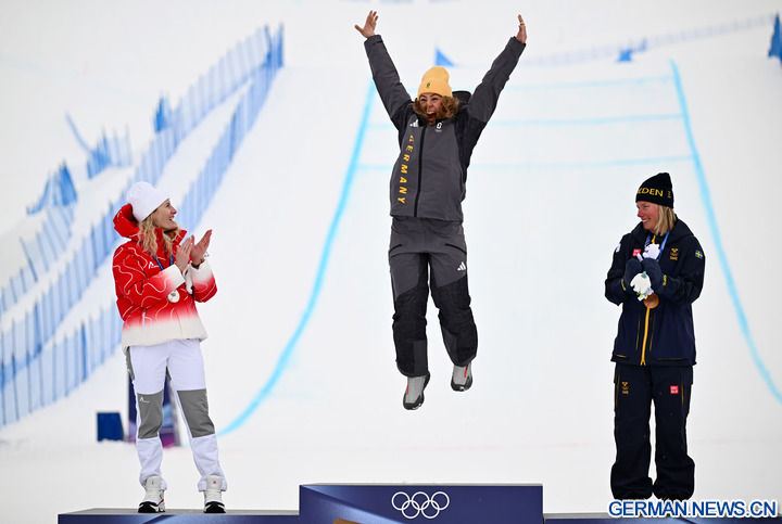 LIVIGNO, 21. Februar 2026 (Xinhua) -- Goldmedaillengewinnerin Daniela Maier aus Deutschland feiert während der Siegerehrung im Skicross der Frauen im Freestyle-Ski bei den Olympischen Winterspielen Milano Cortina 2026 in Livigno in Italien, 20. Februar 2026. (Xinhua/Zhang Hongxiang)