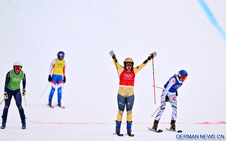 LIVIGNO, 21. Februar 2026 (Xinhua) -- Daniela Maier (2. v. r.) aus Deutschland feiert während des Finales im Skicross der Frauen im Freestyle-Ski bei den Olympischen Winterspielen Milano Cortina 2026 in Livigno in Italien, 20. Februar 2026. (Xinhua/Zhang Hongxiang)