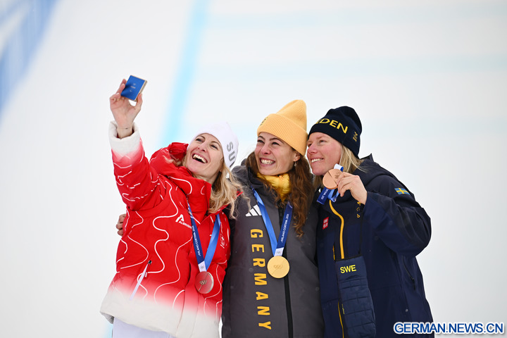 LIVIGNO, 21. Februar 2026 (Xinhua) -- Goldmedaillengewinnerin Daniela Maier (Mitte) aus Deutschland, Silbermedaillengewinnerin Fanny Smith (links) aus der Schweiz und Bronzemedaillengewinnerin Sandra Naeslund aus Schweden machen ein Selfie während der Siegerehrung im Skicross der Frauen im Freestyle-Ski bei den Olympischen Winterspielen Milano Cortina 2026 in Livigno in Italien, 20. Februar 2026. (Xinhua/Zhang Hongxiang)