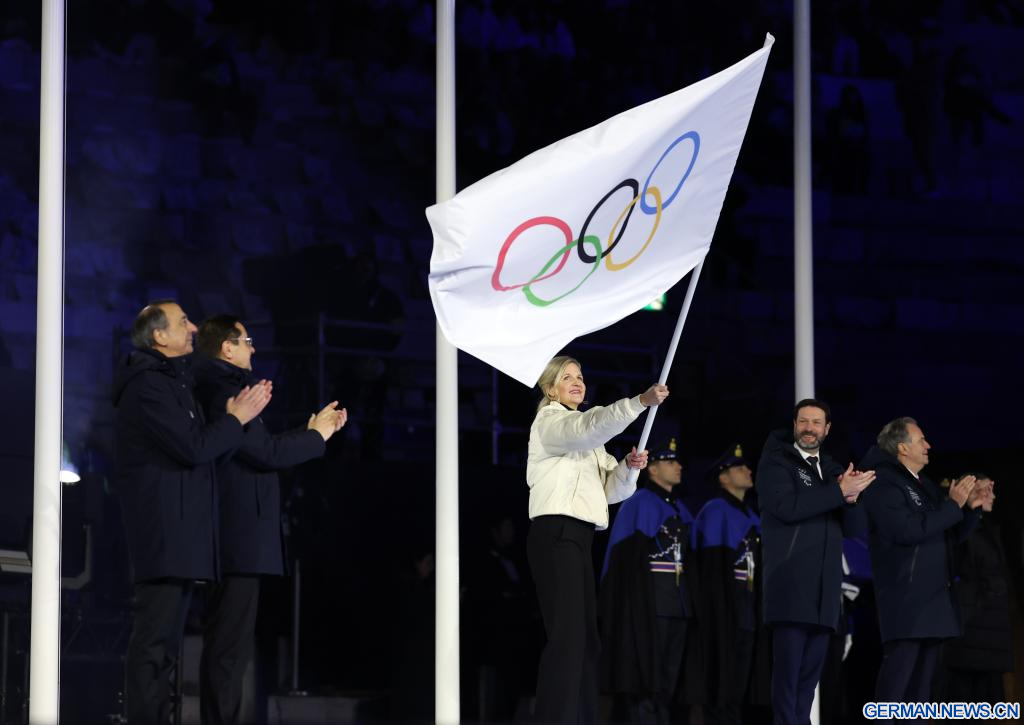 VERONA, 22. Februar 2026 (Xinhuanet) -- Die Präsidentin des Internationalen Olympischen Komitees (IOC), Kirsty Coventry, schwenkt die olympische Flagge während der Abschlussfeier der Olympischen Winterspiele 2026 in Mailand-Cortina in der Verona Olympic Arena in Verona, Italien, 22. Februar 2026. (Quelle: Xinhua/Li Ming)