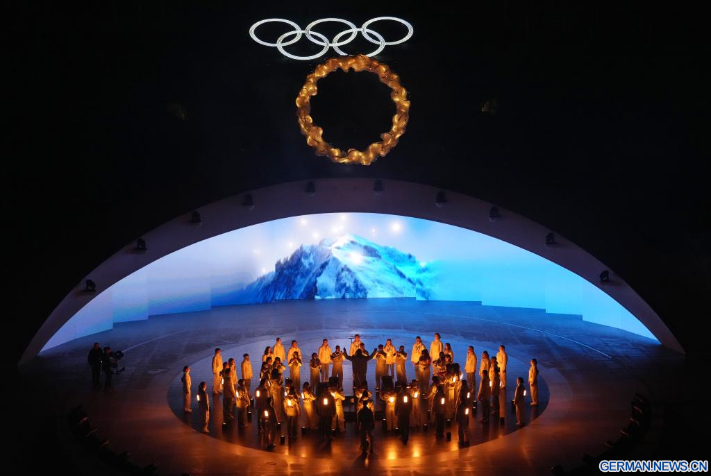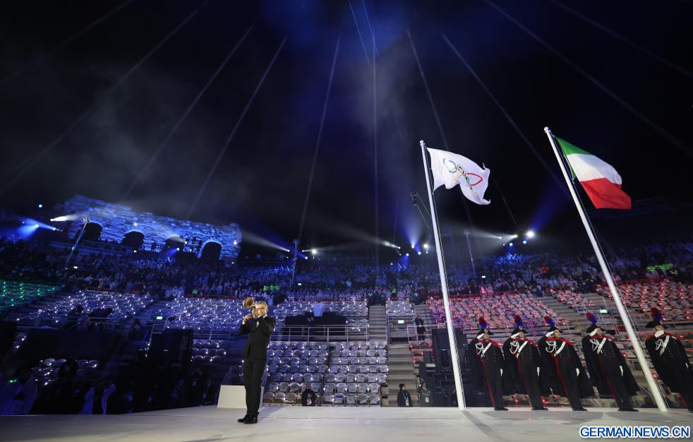 VERONA, 22. Februar 2026 (Xinhuanet) -- Das Foto vom 22. Februar 2026 zeigt die Abschlussfeier der Olympischen Winterspiele 2026 in Mailand-Cortina in der Verona Olympic Arena in Verona, Italien. (Quelle: Xinhua/Li Ming)