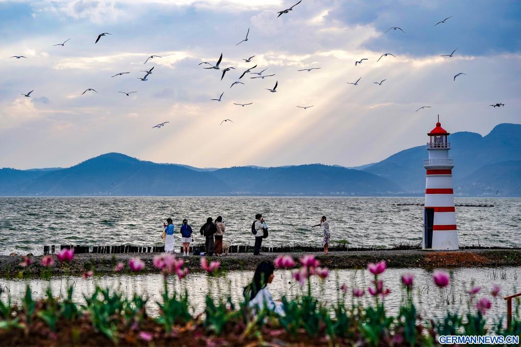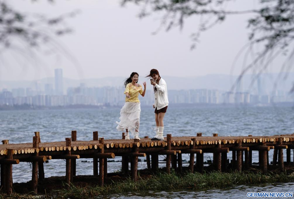 KUNMING, 26. Februar 2026 (Xinhuanet) -- Touristinnen machen Fotos am Dianchi-See in der Stadt Kunming der südwestchinesischen Provinz Yunnan, 26. Februar 2026. (Quelle: Xinhua/Chen Xinbo)