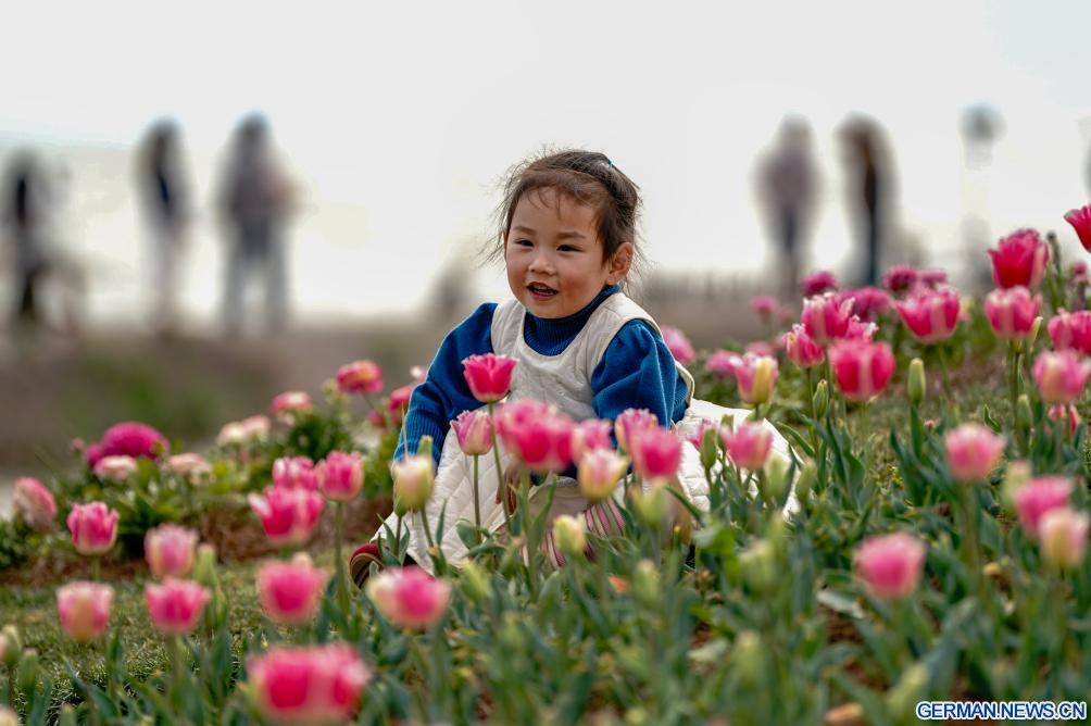 KUNMING, 26. Februar 2026 (Xinhuanet) -- Ein Mädchen posiert neben Tulpen am Dianchi-See in der Stadt Kunming der südwestchinesischen Provinz Yunnan, 26. Februar 2026. (Quelle: Xinhua/Chen Xinbo)
