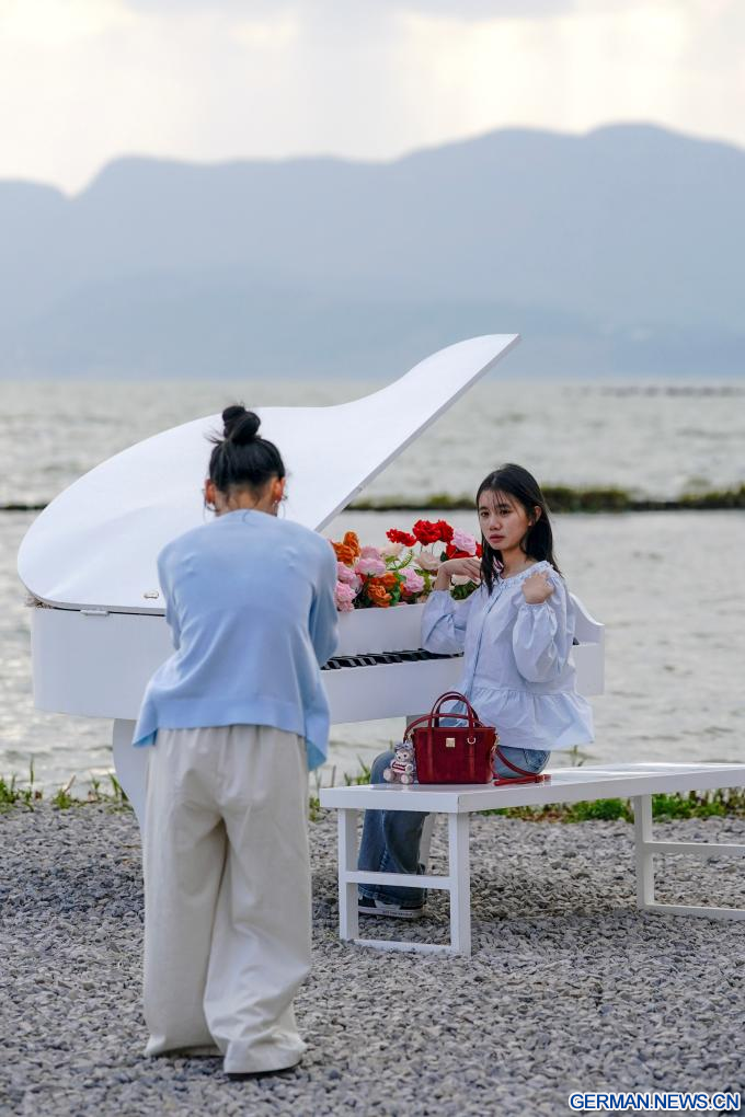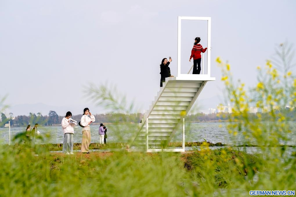 KUNMING, 26. Februar 2026 (Xinhuanet) -- Touristinnen machen Fotos auf einer Installation am Dianchi-See in der Stadt Kunming der südwestchinesischen Provinz Yunnan, 26. Februar 2026. (Quelle: Xinhua/Chen Xinbo)