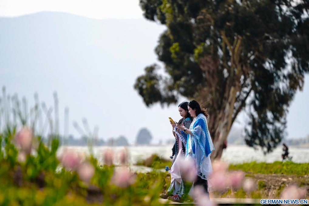 KUNMING, 26. Februar 2026 (Xinhuanet) -- Touristinnen spazieren am Dianchi-See in der Stadt Kunming der südwestchinesischen Provinz Yunnan, 26. Februar 2026. (Quelle: Xinhua/Chen Xinbo)