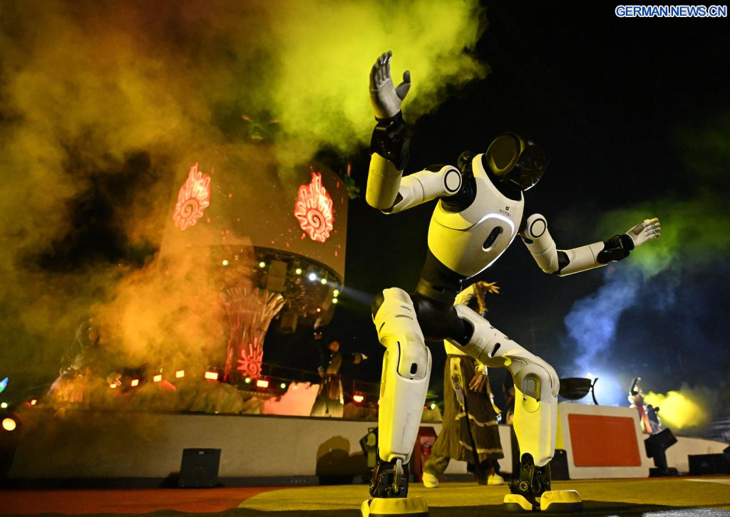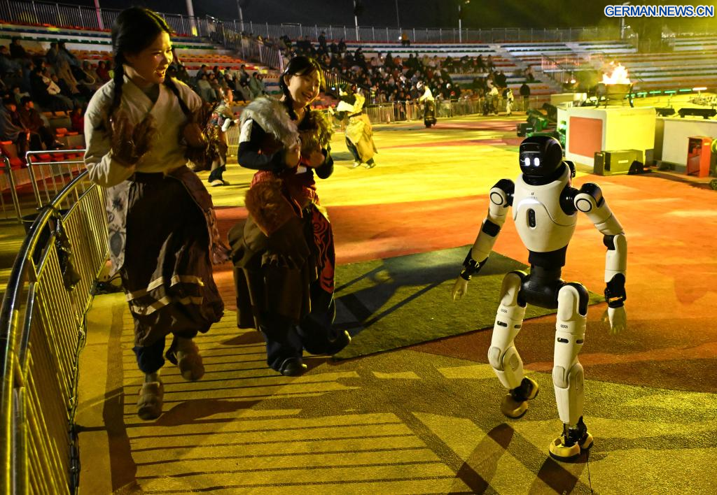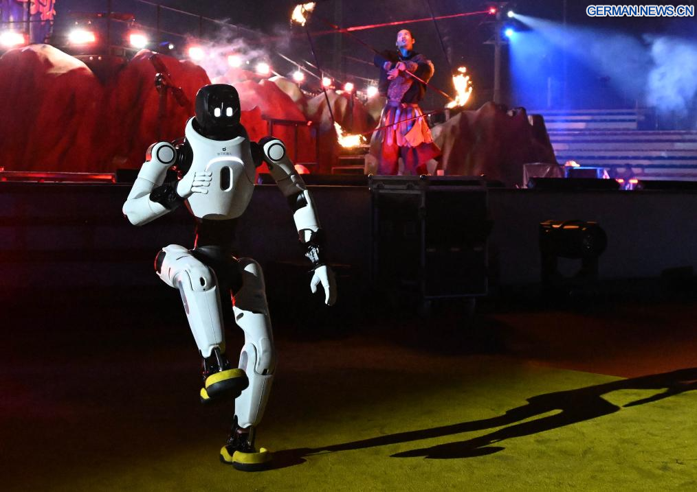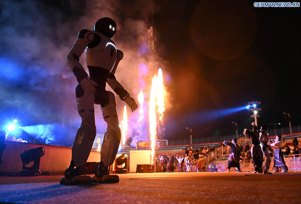 QINGDAO, 27. Februar 2026 (Xinhuanet) -- Ein humanoider Roboter tritt während einer Live-Show zum Thema Mythos in einem Landschaftsgebiet in Qingdao der ostchinesischen Provinz Shandong auf, 26. Februar 2026. (Quelle: Xinhua/Li Ziheng)