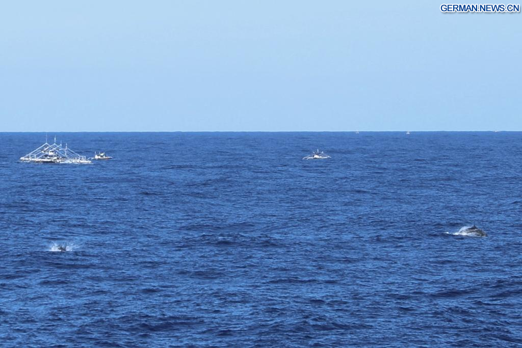 SÜDCHINESISCHES MEER, 2. März 2026 (Xinhuanet) -- Philippinische Schiffe navigieren durch ein Delfin-Aktivitätsgebiet in den Gewässern vor Chinas Huangyan Dao im Südchinesischen Meer, 30. Januar 2026.