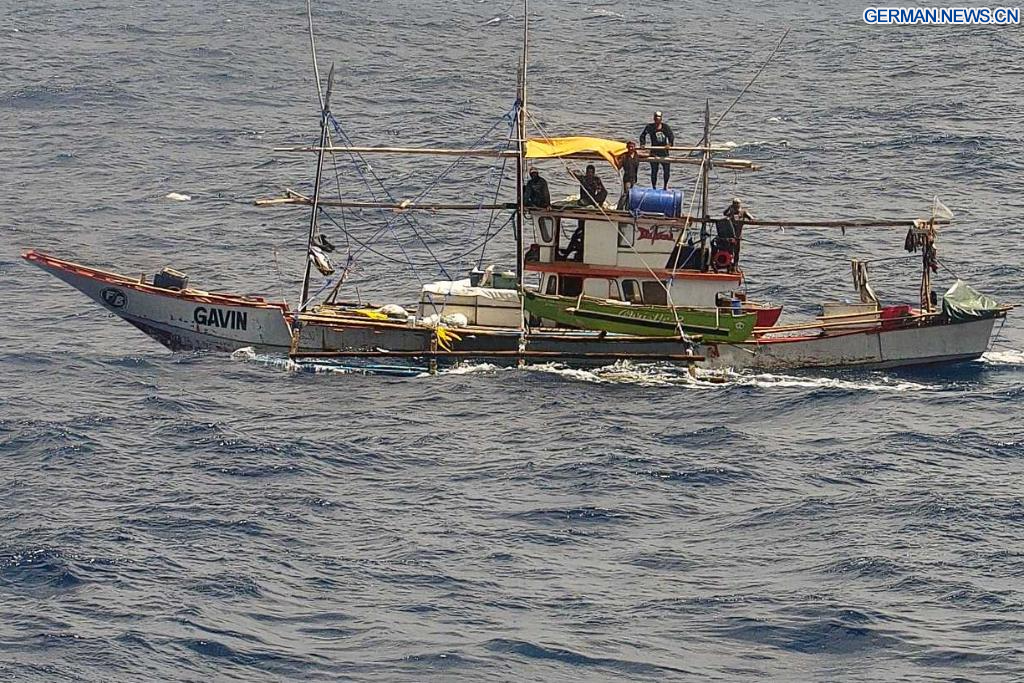 SÜDCHINESISCHES MEER, 2. März 2026 (Xinhuanet) -- Das am 12. März 2025 aufgenommene Archivfoto zeigt ein philippinisches Boot, das Fischsammelgeräte in den Gewässern vor Chinas Huangyan Dao im Südchinesischen Meer ausbringt.