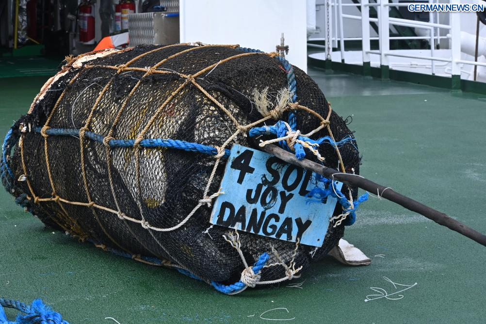 SÜDCHINESISCHES MEER, 2. März 2026 (Xinhuanet) -- Das Foto zeigt die illegal von der philippinischen Seite ausgebrachten Fischsammelgeräte, die auf dem Deck des Schiffes Wanshan der Chinesischen Küstenwache (CCG) im Südchinesischen Meer liegen, 14. Februar 2026.